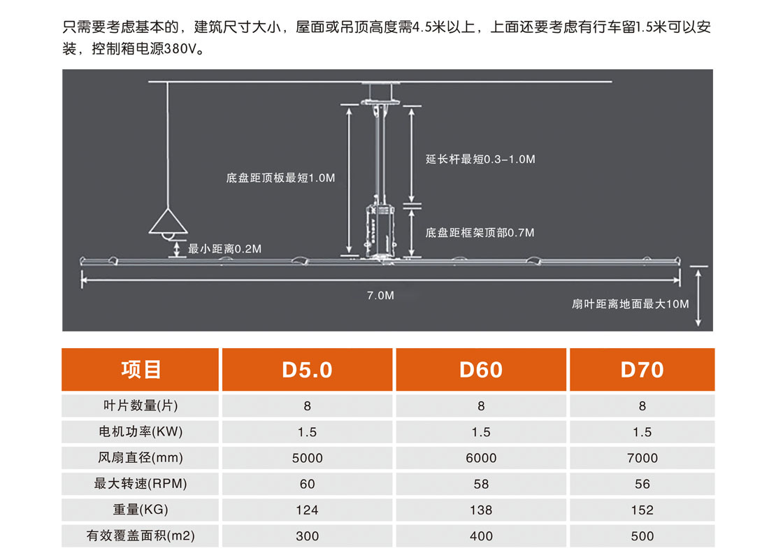 大型工業吊扇直徑達5-7米,功率為1.5千瓦,風力柔和、無噪音,能滿足200-500平方米的室內降溫、通風等要求。